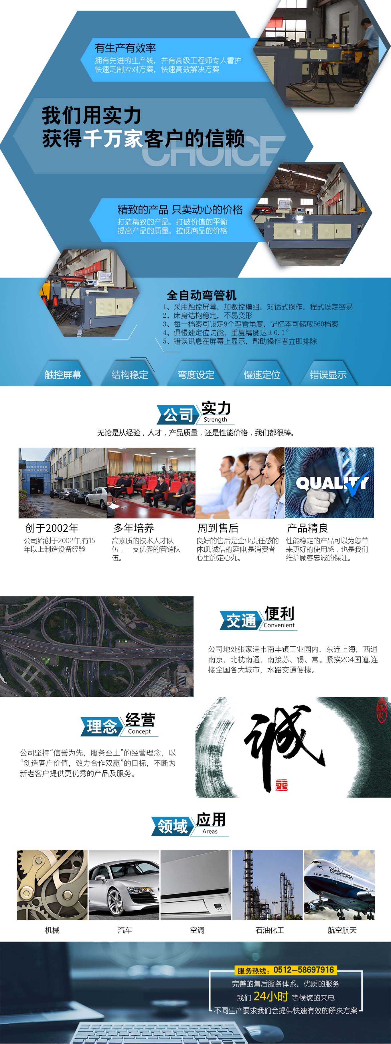 張家港市雙和機械制造有限公司始建于2001年,占地面積12000平方米,南鄰蘇州、無錫、上海,東鄰常州、南京,交通便利,位長三角中間地段,風景優(yōu)美的張家港。 雙和公司至創(chuàng)立開始,引進了國外的設計制造理念,組建了企業(yè)生產管理優(yōu)秀團隊,致力于管材加工機械研發(fā)、設計、制造。創(chuàng)新的設計理念,嚴格的質量把關,專業(yè)的售后服務,不斷提升了我在整個行業(yè)的影響力。 雙和公司生產的系列產品分為彎管機、切管機、縮管機、磨齒機、伺服彎管機、數(shù)控彎管機、液壓彎管機、自動切管機、管端成型機、倒角機、大弧滾圓機、鋁切機、壓彎機等管材加工機械,廣泛用于航天業(yè)、造船業(yè)、汽車制造、鍋爐制造、自行車、摩托車、體育健身器材、管制品家...